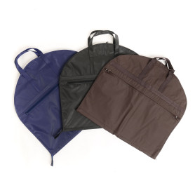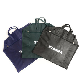 Copriabito in Pet TNT Nero, con manici standard cuciti sui bordi, zip centrale in tinta, anello in TNT applicato sul fondo.